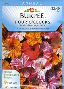 Plus, the blossoms of some varieties are streaked, splashed, or striped in a host of colors. Four o�clock�s, so named because they typically bloom late in the afternoon, are among the most colorful, fragrant, and robust of all flowers that can be grown from seed. This popular annual species is known to add tons of joyful color to garden spaces, containers, and walkways, with 3 blooms in sherbet like shades of orange, pink, red and white. Four o'clock (marvel of peru) seeds plus planting instructions. This plant is attractive to bees, butterflies and/or birds.