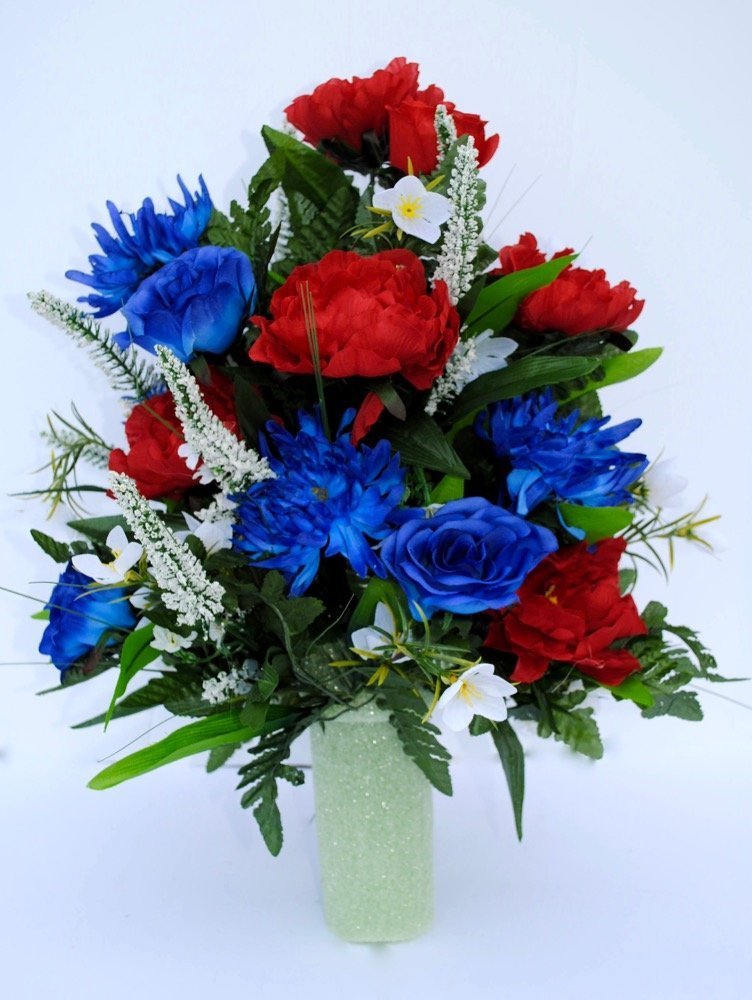 This cemetery vase is perfect for your loved one(s). Spring flower arrangements church pews wedding altar vases receptions cemetery. This arrangement has two shades of blue flowers, red filler flowers, a lime green hydrangea and greenery. Items similar to patriotic cemetery vase red white blue roses and deco mesh american flag display tribute memorial. Plastic flowers for decoration in vase artificial accessories natural flower seeds garden the cemetery plant wall a dried pampas.
